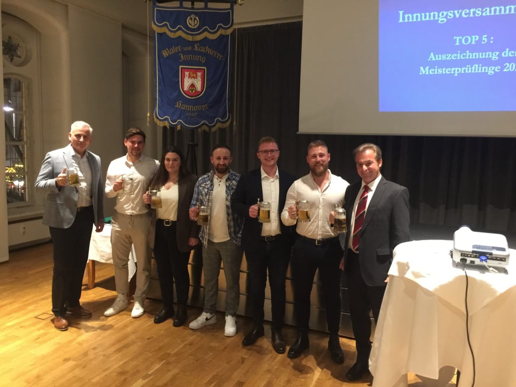Am 12.12. konnte Obermeister Manuel Kalogeropoulos 115 Mitglieder und Gäste im Festsaal im Alten Rathaus in Hannover begrüßen. Im Gespräch mit Kai Winkelvoss, Inhaber der Firma einzA, wurde über die Zukunft des Malerhandwerks diskutiert. Daneben wurden zahlreiche Ehrungen vorgenommen für die Gewinner des Fassadenwettbewerbs 2024 und die Mitglieder. Wieder einmal besonders war der Meistertrunk mit den jungen Meistern des Jahrganges 2024. Denn Abschluß bildete dann das traditionelle Grünkohlessen und viele Gespräche an einem geselligen Abend.